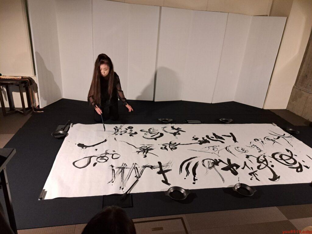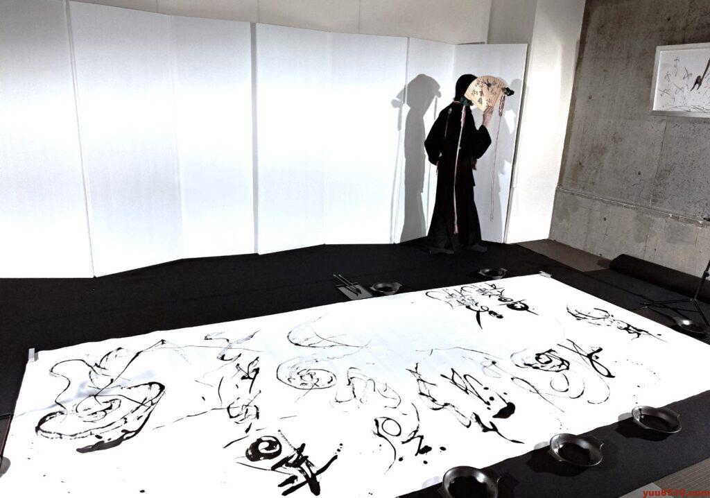 後半は、ギャラリー遊にて、筆舞「天地創造」と新たに「今昔物語」も加え、2演目の実演です。参加した塾生たちは、筆舞パフォーマンスの基礎を学びました。