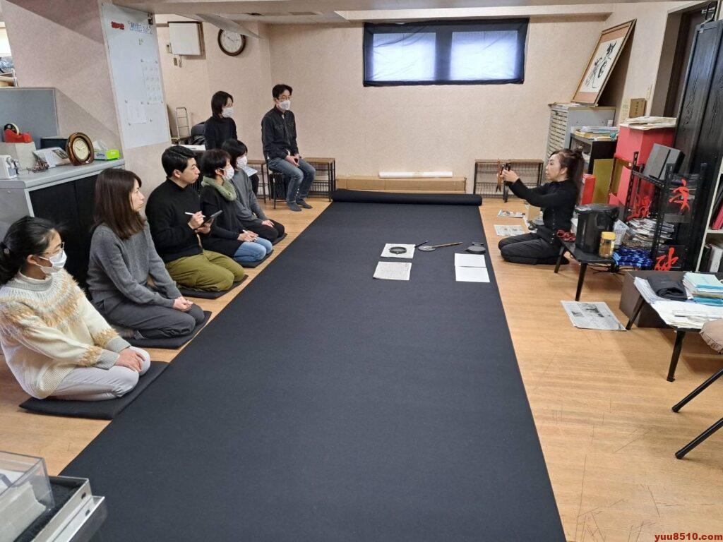 優美舎の「大筆大会」では、実際に大筆を使って書く前に、使う筆や道具の説明を行い、理解を深める時間を設けています。
